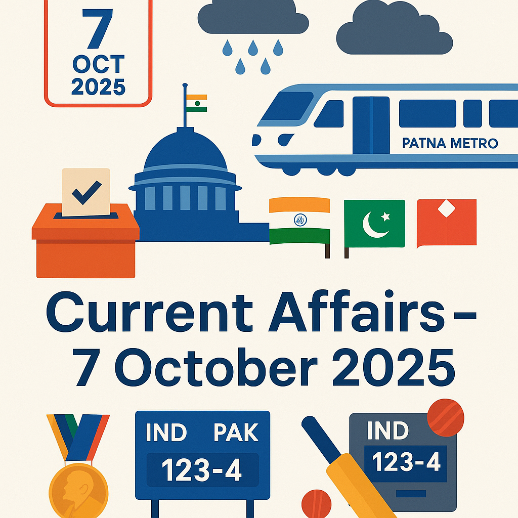 📰  Introduction The 7th of October 2025 brings together key developments across politics, infrastructure, economy, global affairs, and sports. From Bihar’s much-anticipated election schedule to India’s cricket triumph against Pakistan, today’s headlines are a must-read for exam aspirants and news enthusiasts alike. 🏛️  Elections & Governance Election Commission announces 17 new initiatives for Bihar polls The Election Commission of India has introduced 17 new initiatives to strengthen transparency and voter participation, first implemented in Bihar’s assembly elections. Polling will be held in two phases — on 6th and 11th November, with counting scheduled for 14th November. The EC also announced by-elections for eight seats in seven states on 11th November. Patna Metro Phase-1 inaugurated Bihar Chief Minister Nitish Kumar inaugurated the first phase of the Patna Metro Rail Service today. The metro will open to the public tomorrow, marking a major milestone for urban transport in the state. He also transferred ₹10,000 each to 21 lakh women under the Mukhyamantri Mahila Rozgar Yojana, aimed at boosting women’s financial empowerment. 👉 Read related updates: 🏥  Health & Citizen Services The Union Health Ministry has advised all states and union territories to ensure rational use of cough syrups, especially among children, to avoid misuse and adverse effects. Additionally, the UIDAI has waived all charges for Aadhaar biometric updates for children aged 7 to 15 years, allowing free updates through authorized centers. 🌧️  Weather & Disaster Updates Nepal landslides and heavy rains At least 52 people have been killed in Nepal following landslides and floods triggered by torrential rain. In India, Darjeeling Hills and parts of Bihar reported severe rainfall damage and lightning deaths. IMD red alert The India Meteorological Department (IMD) has issued a red alert for heavy to very heavy rainfall and hailstorms across northwestern states, including parts of Himachal Pradesh, Uttarakhand, and Punjab. 👉 Related topics: 🌏  International Affairs Israel–Hamas ceasefire talks in Cairo Delegates from Israel, Hamas, and the United States have gathered in Cairo for indirect negotiations on a U.S.-proposed Gaza ceasefire plan, aiming to stabilize the region after months of conflict. UK Prime Minister Keir Starmer’s visit to India British Prime Minister Keir Starmer will embark on a two-day visit to India starting 8th October, focusing on enhancing trade, climate, and defence cooperation. UPI launched in Qatar In a major step for fintech diplomacy, India’s Unified Payments Interface (UPI) has been launched in Qatar, strengthening digital and financial cooperation between the two nations. 👉 Read more: 🏅  Sports Updates India defeats Pakistan in Women’s World Cup In a thrilling match at Colombo, India defeated Pakistan by 88 runs in their second ICC Women’s ODI World Cup 2025 fixture. The victory bolstered India’s campaign and thrilled fans worldwide. India’s Para Athletics success India wrapped up its campaign at the World Para Athletics Championships with a record 22 medals — 6 Gold, 9 Silver, and 7 Bronze, marking its best-ever performance at the event. Badminton: Double title win in Abu Dhabi India clinched both the Women’s Singles and Men’s Doubles titles at the Al Ain Masters 2025 in Abu Dhabi, continuing its excellent run in international badminton. 👉 Sports Coverage: 🔬  Science & Recognition The Nobel Prize in Medicine 2025 has been awarded to Mary E. Brunkow, Fred Ramsdell (USA) and Shimon Sakaguchi (Japan) for their discoveries on peripheral immune tolerance, a breakthrough that has transformed autoimmune disease research. ⚠️  Law & Order Curfew was imposed in Cuttack, Odisha, following violent clashes during a Durga Puja procession. Meanwhile, in Jaipur, the Rajasthan government has formed a six-member committee to probe the fire at Sawai Man Singh Hospital, which claimed six lives. 🧾  Key Takeaways 📘  Further Reading ✦ Stay Connected with PrudhviInfo ✦ ✦ For more daily current affairs, exam prep notes, and trending updates, follow us here: Follow on Facebook Follow on Twitter (X) Follow on Instagram Join on WhatsApp